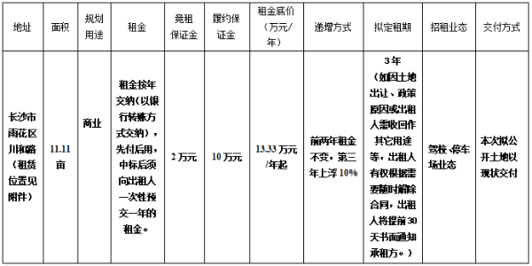 为确保公平公正,长沙市雨花区原红灯鞭炮厂土地招租方式为现场公开竞价,实行一次报价的方式,如最高报价相同,则最高报价者进行二次竞价,价高者得,如竞租人只有1人,则由该竞租人承租。