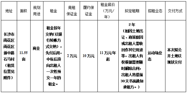 3、经资产管理部审核确认符合竞租资格成功办理意向登记的竞租人,应在报名截止日期2022年1月14日下午16:00之前支付2万元竞租保证金(以到账时间为准)至长沙市雨花城bob综合体育官网app下载设出资集团有限公司的指定账户(保证金指定账户:长沙市雨花城bob综合体育官网app下载设出资集团有限公司;长沙农村商业银行股份有限公司圭塘支行账号:8201 0100 0000 83291)。若租赁承租成交,在租赁合同签订后,则竞租保证金可转为租金的一部分;若未能成交则竞租保证金原途径全额无息退还。