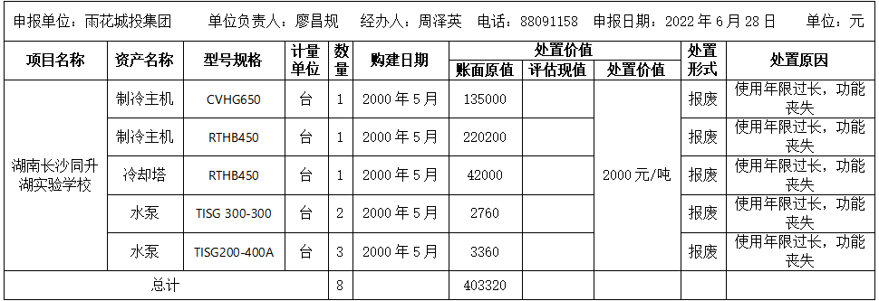 长沙市雨花城bob综合体育官网app下载设出资集团有限公司因资产核销所涉及湖南长沙同升湖实验学校中央空调主机设备资产需处置(核销),根据《关于进一步规范区国有企业国有资产交易监督管理有关事项的通知》雨游艇会yth0008﹝2021﹞6号文件精神,向社会公示。按照文件精神,现将长沙市雨花城bob综合体育官网app下载设出资集团有限公司所需处置(核销)的资产现场勘查(详情见下表)等情况,予以公示。公示时间为2022年6月30日至2022年7月6日。